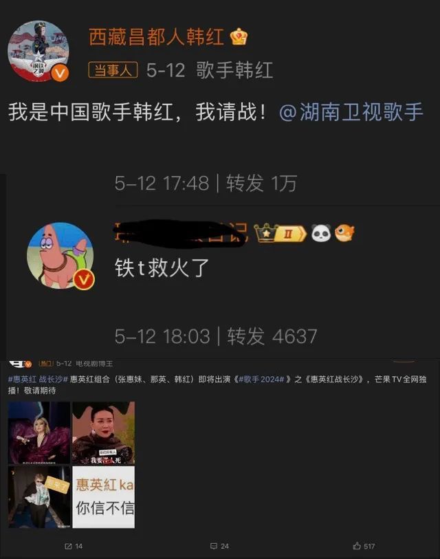 以及,让节目组再邀请一个张惠妹,这样加上那英和韩红,就能召唤出非常能打的“惠英红”!