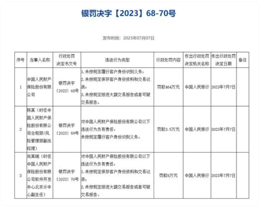 凤凰网梳理发现,去年7月份,中国人民财产保险股份有限公司还曾因未按规定履行客户身份识别义务、未按规定保存客户身份资料和交易记录、未按规定报送大额交易报告或者可疑交易报告,被中国人民银行罚款464万元。