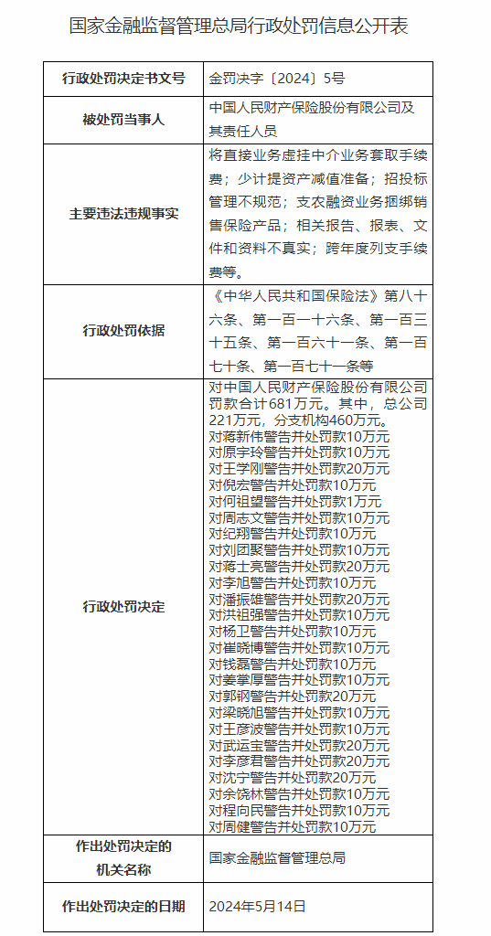 行政处罚决定书金罚决字〔2024〕5号显示,中国人民财产保险股份有限公司主要违法违规事实为:将直接业务虚挂中介业务套取手续费;少计提资产减值准备;招投标管理不规范;支农融资业务捆绑销售保险产品;相关报告、报表、文件和资料不真实;跨年度列支手续费等。
