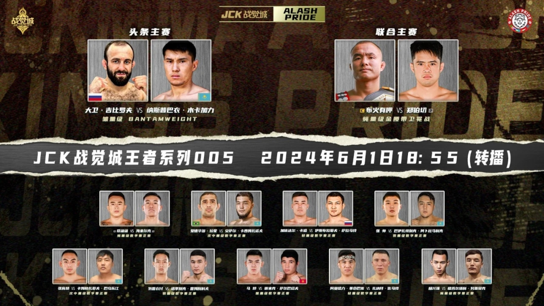 头条主赛由JCK现任雏量级冠军王绍祥对决国内雏量级排名第一的吴泽,联合主赛中连续多场首回合终结对手的吉木五沙迎战“铁骑”都力勒。