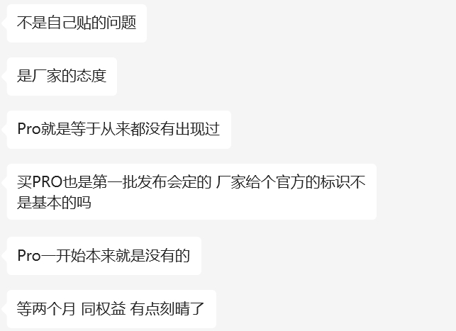 对于Pro版没独立尾标的问题,小米社区的官方人员“社区大管家”在和在回复中表示:“关于尾标:尾标虽然只是几个字,也要上工信部公告哒,不过我们的产品经理已经听到大家声音,在研究中了哦”。