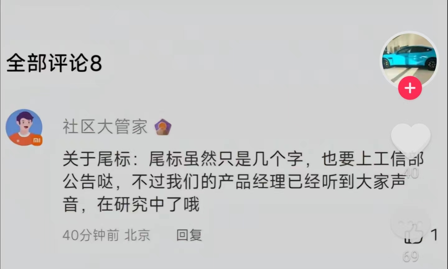 有车主认为小米SU7 Pro相较于SU7标准版和SU7 Max,在小米汽车序列中“无名无分”,“Pro就是等于从来都没有出现过”。从多个主流社交平台的留言来看,对小米SU7 Pro不给单独尾标有意见的准车主不在少数。