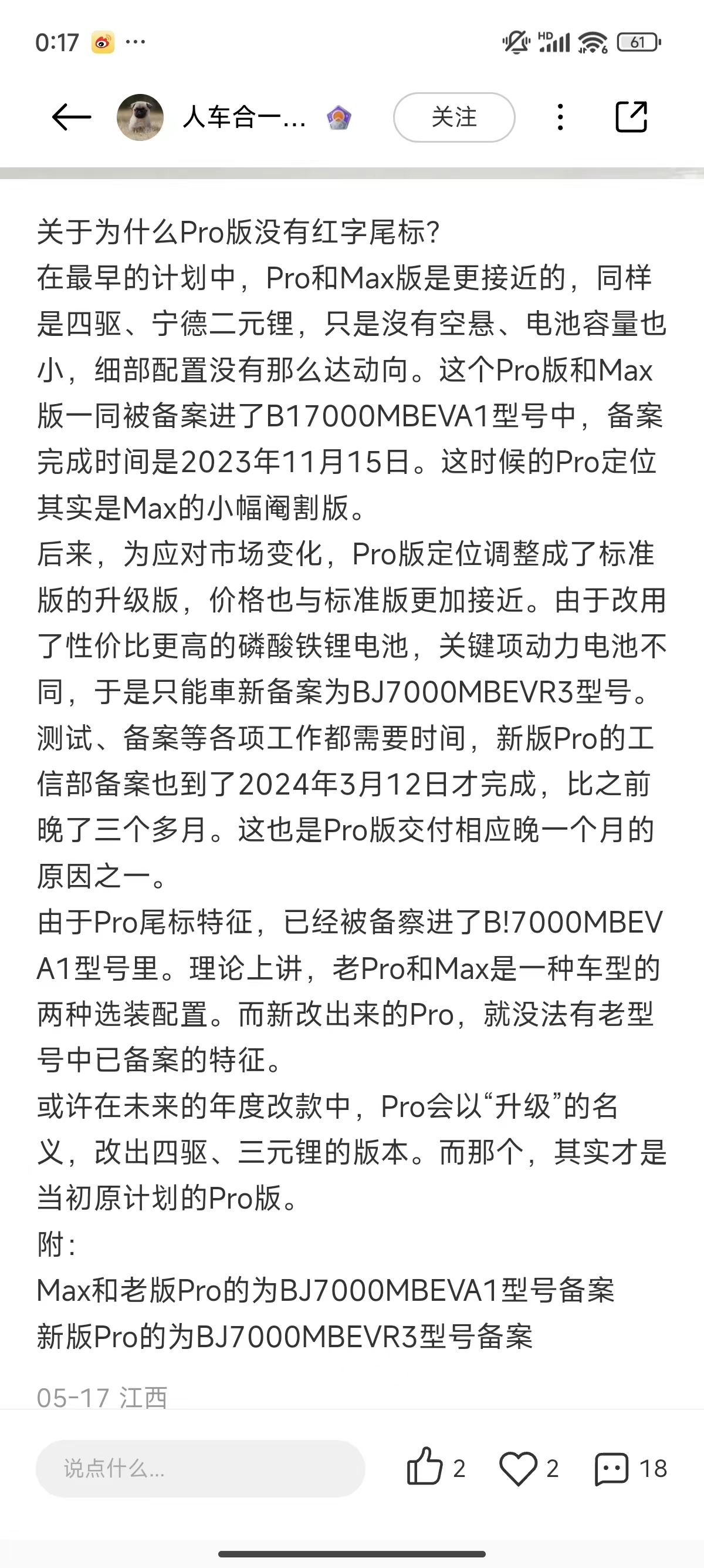 “后来,为应对市场变化,Pro版定位调整成了标准版的升级版,由于改用了性价比更高的磷酸铁锂电池,关键项动力电池不同,于是只能重新备案为BJ7000MBEVR3型号。”