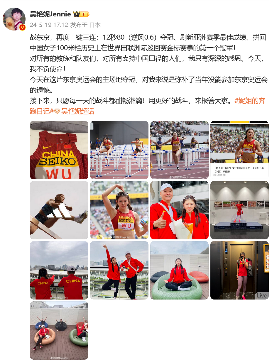 吴艳妮晒多张照片发文:“战东京,再度一键三连:12秒80(逆风0.6)夺冠、刷新亚洲赛季最佳成绩、拼回中国女子100米栏历史上在世界田联洲际巡回赛金标赛事的第一个冠军!对所有的教练和队友们,对所有支持中国田径的人们,我只有深深的感恩。今天,我不负使命!今天在这片东京奥运会的主场地夺冠,对我来说是弥补了当年没能参加东京奥运会的遗憾。接下来,只愿每一天的战斗都酣畅淋漓!用更好的战斗,来报答大家。”