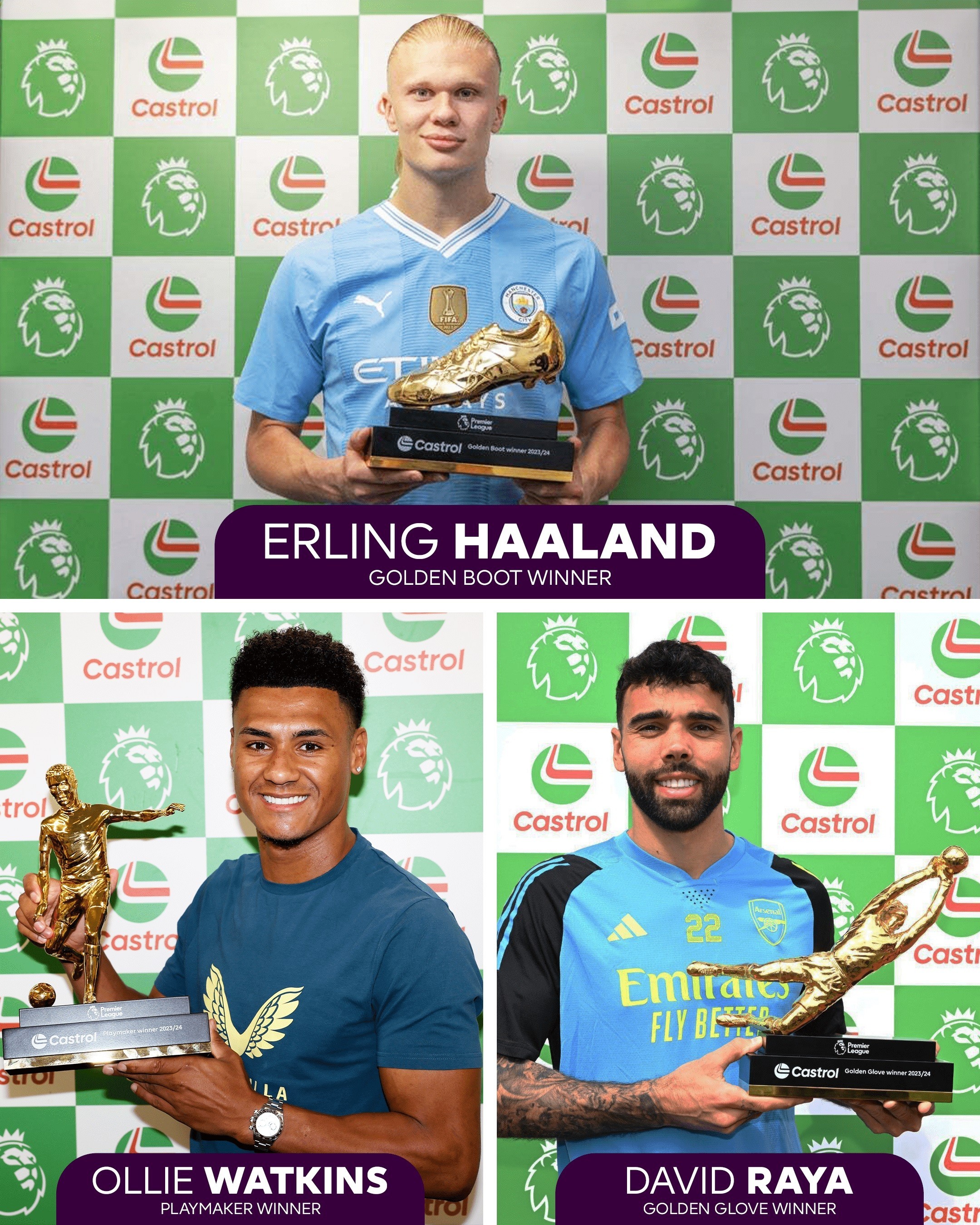 英超官方晒出了三位得奖者拿着奖杯的照片。曼城前锋哈兰德以27粒进球高居射手榜榜首,这也是他继上赛季后蝉联这一奖项;阿斯顿维拉前锋沃特金斯以13次助攻拿到了助攻王奖杯;而阿森纳门将戴维-拉亚以16次零封获得了金手套奖。