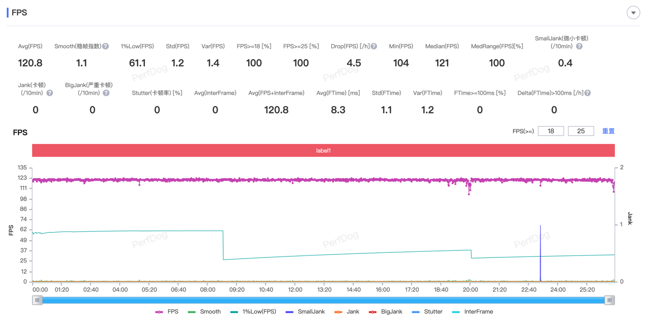 简单测试一下 vivo Y200 GT 的游戏表现,在室温 25 度的环境下,将《王者荣耀》画质设置为 120 帧+高清画质。在去除中间换局的掉帧环节后,半小时排位赛平均帧率 120.8 帧,总体表现非常流畅。