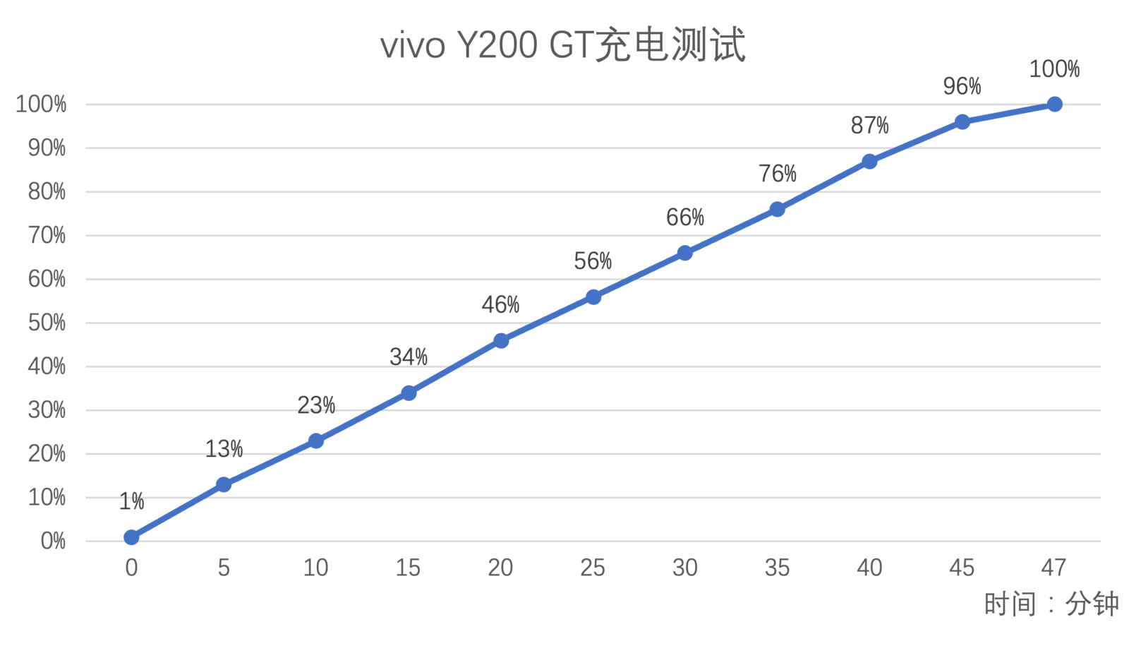 充电上,vivo Y200 GT 配备 80W 远航闪充,实测从 1% 电量开始充电,10 分钟充入23%,23 分钟充入50%,最后充至 100% 电量用时 47 分 24 秒。虽然从充电时间上看不算理想,但 6000mAh 大电池足以缓解续航焦虑了。