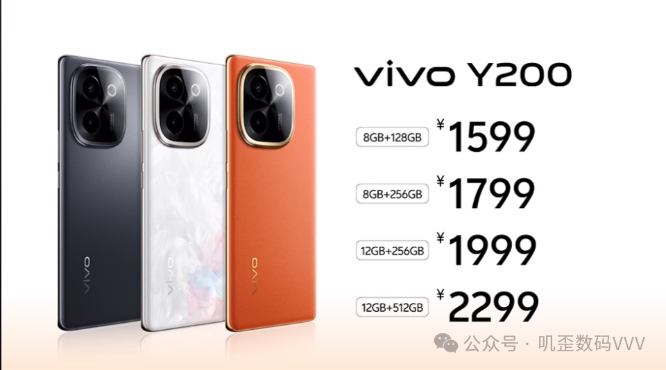 最后是价格,vivo Y200的8GB+128GB版本1599元,8GB+256GB版本1799元,12+256GB版本价格1999元,12+512GB版本价格2299元。