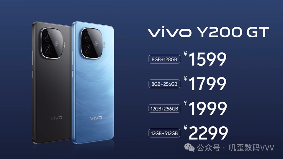 vivo Y200 GT的8GB+128GB版本1599元,首销限时优惠100元,仅1499元起,8GB+256GB版本1799元,12+256GB版本价格1999元,12+512GB版本价格2299元。