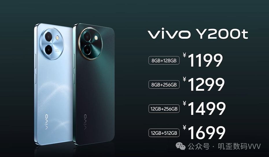 vivo Y200t的8GB+128GB版本1199元,首销限时优惠100元,仅1099元起,8GB+256GB版本1299元,12+256GB版本价格1499元,12+512GB版本价格1699元。