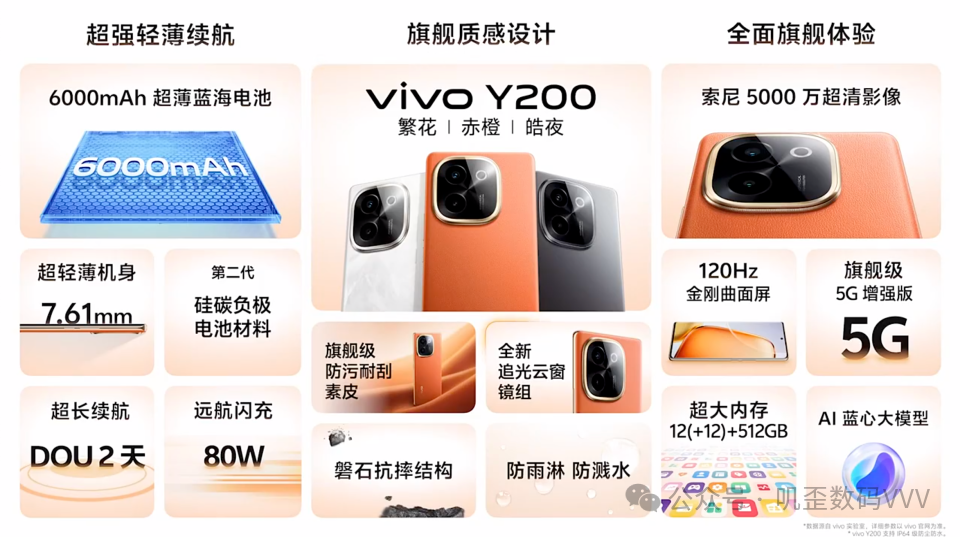 vivo Y200的性能方面搭载了高通第一代骁龙6处理器,内置了80W快充以及6000mAh大电池,官方表示DOU可以达到2天,而机身厚度仅为7.61mm,是同容量里机身最薄,重量仅为186g。影像部分,vivo Y200搭载了索尼旗舰级光喻LYT600传感器,支持5000万全像素双核对焦技术与光学级2倍变焦,还有一颗200万像素的虚化镜头。