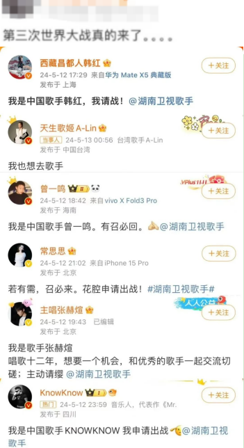 这种粉丝喊话、歌手请战的势头愈演愈烈,甚至央妈都亲自下场。
