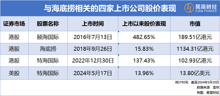 从几家公司上市以来的表现来看,海底捞的火锅生意获得二级市场的“好评”。截至5月20日,这四家公司市值合计超1500亿港元。