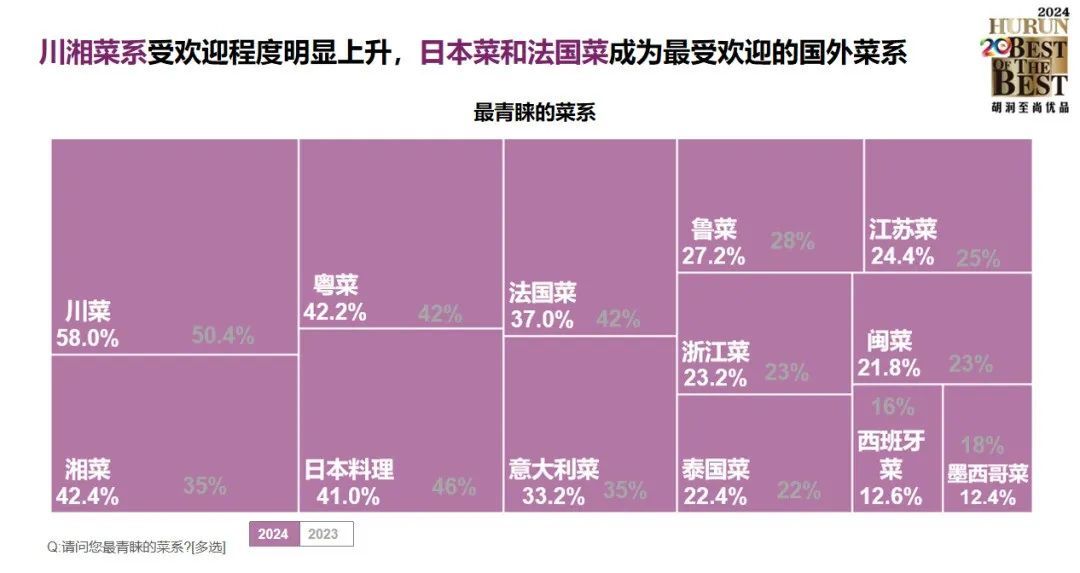 就在近日,胡润百富发布一则视频称,对750位千万资产中国高净值人士,进行饮食偏好调查后发现,川菜最受人喜欢。对比2023年,川湘菜系受欢迎程度明显上升,日本菜和法国菜成为最受欢迎的国外菜系。
