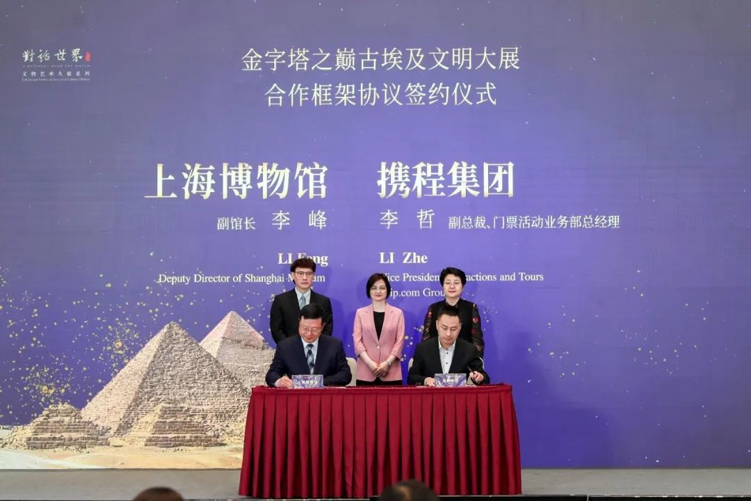 推介会上,上海博物馆与携程集团进行合作框架协议签约仪式,埃及旅游和文物部最高文物委员会秘书长伊斯梅尔,上海市文化和旅游局党组书记、上海市文物局局长钟晓敏,上海博物馆馆长褚晓波见证签约仪式。