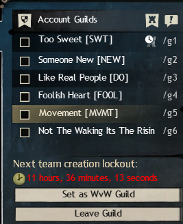 部分WvW优化: 第6个公会槽 事件面板显示领主血条 攻城干扰器无法被格挡 提升营地3级补给和补给投放战术 冰冻雾气改为治疗盟友而不再冰冻敌对玩家 |