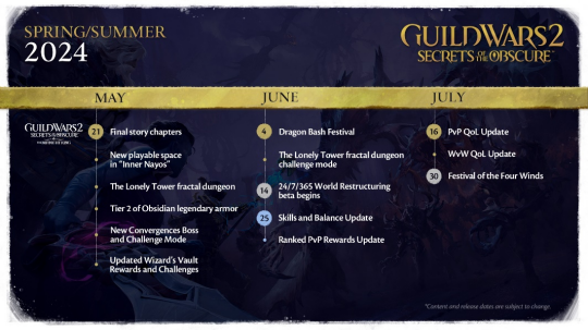 近期,A社发布春夏季路线图博文,文中提及将更新多项内容,还有额外奖励事件或节日。本文将按时间顺序整理今年5月至7月间PvE、WvW、PvP更新及奖励事件与节日,所包含的时间均为预测的国服时间,具体时间及内容以游戏实装为准。