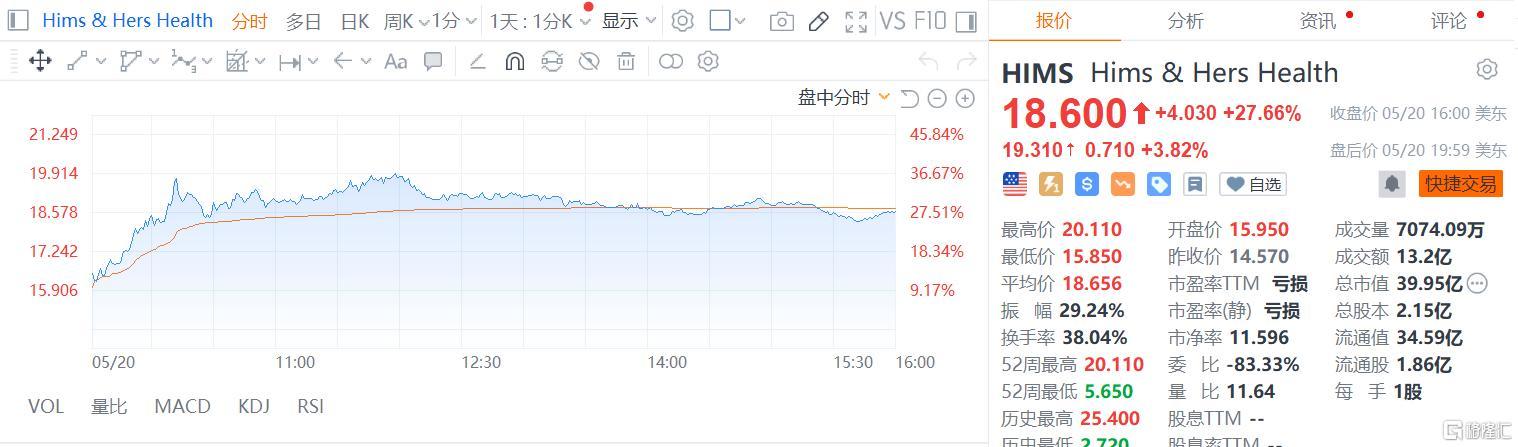 受此消息影响,Hims周一股价暴涨,盘中最高暴涨近40%,截至收盘涨27.66%。