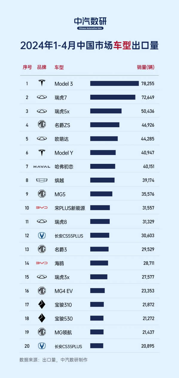 智车派认为,中国市场的车型出口量在前4月呈现出稳定的发展态势。特斯拉Model 3、瑞虎7等车型的强势表现进一步巩固了它们在市场中的领先地位,中国自主品牌也展现出强劲的发展势头。