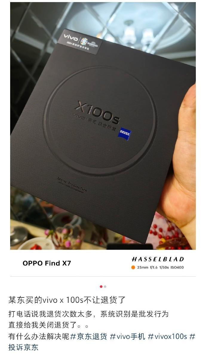 近日在社交平台上就有“摸摸党”翻车的案例。某社交平台用户发帖称他在京东上购买的vivo手机七天无理由退货被拒绝,原因是“退款次数太多,系统识别是批发行为,直接关闭退货”。