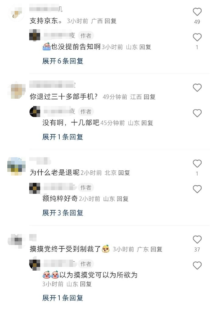 后续作者在和网友的互动中说到,他在京东平台退货过十几部手机。也许退货的数量过多触发了京东内部的某些监测机制,最终才被拒绝退款。