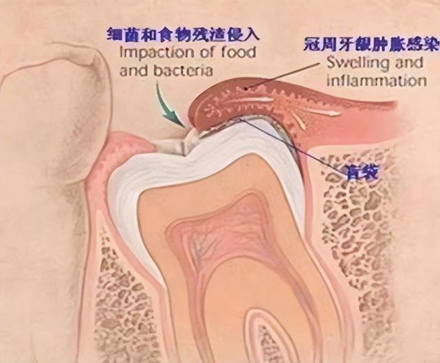 3、常常因无法完全萌出,牙冠的一部分被牙龈包绕,形成盲袋,食物残渣易进难出,导致牙龈红肿、盲袋溢脓,患者会有疼痛、开口困难,甚至出现发热等全身症状,这就叫“智齿冠周炎”,且容易反复发作,严重时会导致颌面部多间隙感染;