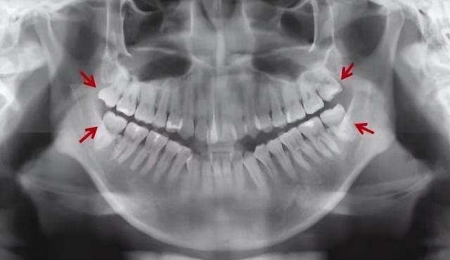 3.如果智齿倾斜,牙冠直接抵到前面牙齿的牙根或牙颈部部位,也需要拔掉。