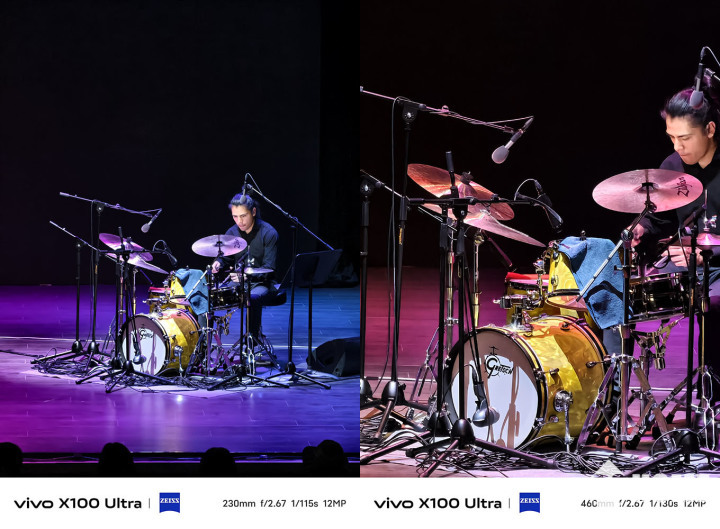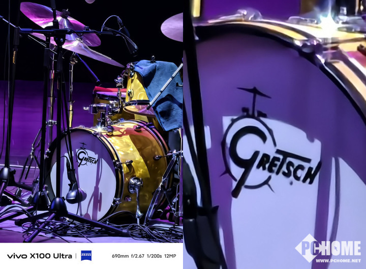 而且随着放大倍率的提高,vivo X100 Ultra依旧能确保不错的清晰度,比如架子鼓上面的品牌就可以看得一清二楚,放大后,画面细节会有一些锐,不过这已经是非常不错的水准了。