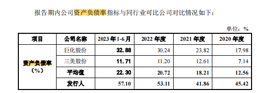 数据显示,2020年至2023年,永和股份的资产负债率分别为 45.42%、41.86%、53.11%、60.83%,资产负债率四年合计攀升15.41个百分点;2020年至2022年,同行业可比公司平均值为12.56%、18.21%、20.72%。另据证券软件显示,2023年行业平均资产负债率为44.5%,低于永和股份的资产负债率。