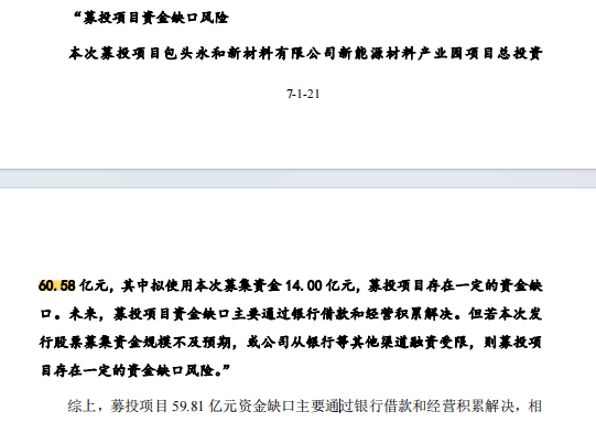 永和股份此前公告称,未来,募投项目资金缺口主要通过银行借款和经营积累解决。但若发 行股票募集资金规模不及预期或从银行等其他渠道融资受限,募投项目存在一定的资金缺口风险。