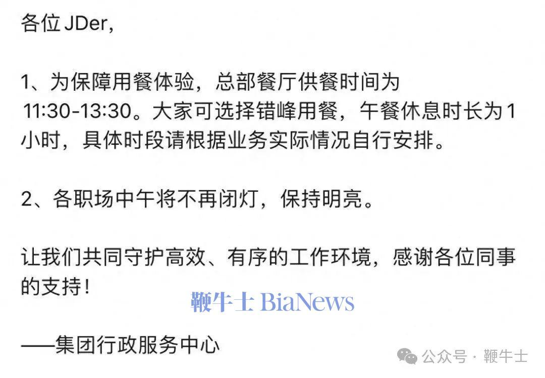5月21日,京东集团行政服务中心正式发布通知,对总部餐厅的供餐时间和职场照明管理进行了优化调整。