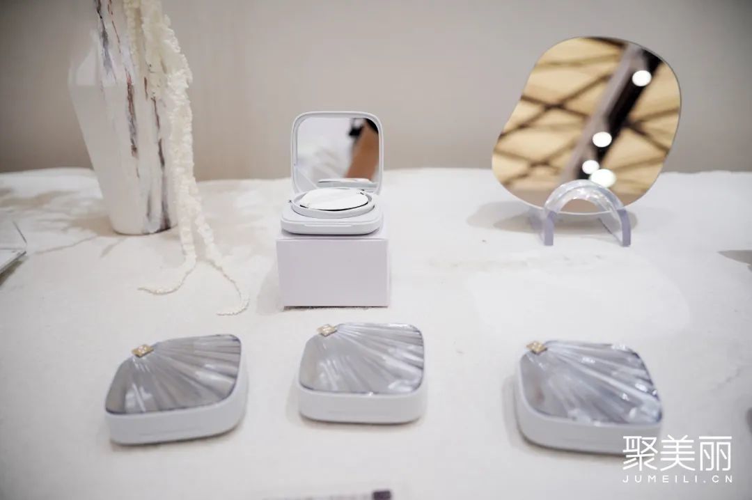 防晒气垫则主打“上妆即防晒”,通过锁水持妆膜+持久防晒膜双膜协同,其防晒值达到了SPF50 PA+++;在妆效上,品牌以超细圆球妆粉体搭配有机硅弹性体,打造了柔雾妆效;在视觉设计上,该单品顶部天片造型来源于丁达尔效应,同时也类似贝壳外形,产品蓝调银色系外壳。