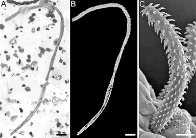 琥珀中的绦虫化石(A, 光学显微镜图像;B, 显微计算机断层扫描图像)及与现生锥吻目(C, 电子显微镜图像)的比较。