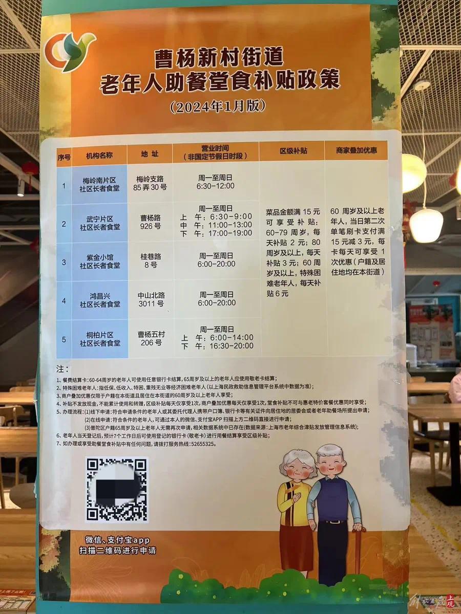 在普陀区曹杨新村街道武宁片区社区长者食堂,一张“补贴政策”说得明明白白:老年人在这里消费满15元,就能获得区级补贴,其中60周岁至79周岁的补贴为每天2元,80周岁及以上的每天补贴3元;60周岁及以上、特殊困难老年人,每天补贴6元。同时,食堂有商家叠加优惠,即60周岁以上老年人,当日第二次单笔刷卡支付满15元减3元。当然,这些补贴都不是现金,而是消费时接抵扣。此外,还有堂食特惠套餐。
