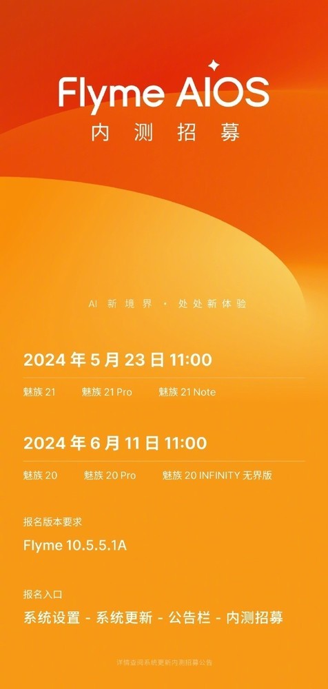 【CNMO科技消息】5月23日,CNMO注意到,据魅族手机官方消息,魅族Flyme AI OS内测招募已经于5月23日早间11点正式开启。目前,魅族21、魅族21 PRO和魅族21 Note这三款机型的用户可以参与活动报名尝鲜。2024年6月11日早间11点,魅族20、魅族20 PRO和魅族20 INFINTY无界版开启招募,报名版本要求Flyme 10.5.5.1A。目前,这三款机型的用户可以在系统设置——系统更新)公告栏——内测招募里报名参与魅族Flyme AI OS内测。