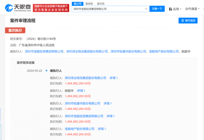 据天眼查法律诉讼信息显示,5月22日,姚振华、深圳市宝能投资集团有限公司、宝能地产股份有限公司、深圳深业物流集团股份有限公司等新增2则被执行人信息,执行标的合计22.88亿余元,执行法院均为广东省深圳市中级人民法院。