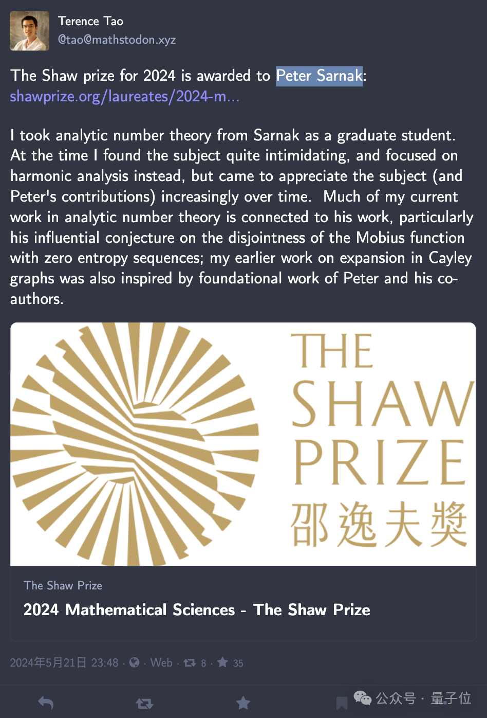 陶哲轩第一时间送上祝贺,并透露研究生期间曾上过他的课,但“难到吓人”: