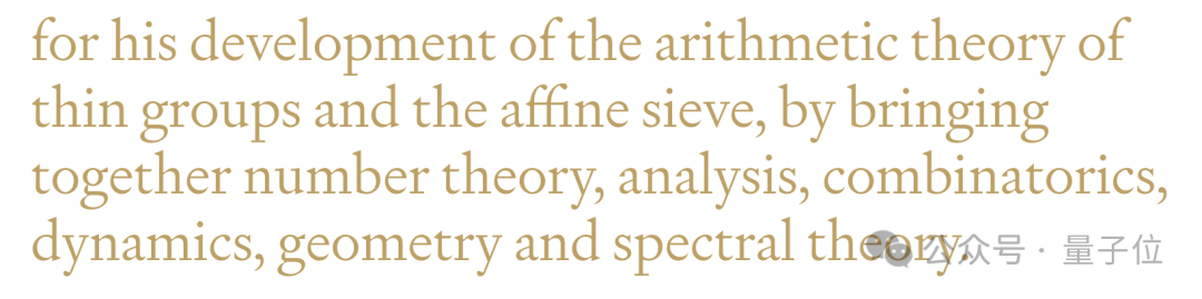 表彰他将数论、分析学、组合学、动力学、几何学和谱论相结合,发展了薄群算术理论和仿射筛法。