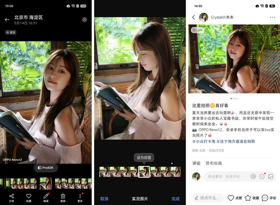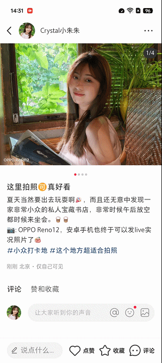 当然,这次OPPO Reno12更大的优势与不同之处在于,相比与其他能拍摄动态照片的安卓手机不同,其不但能够拍摄实况照片,并且还可以将实况照片分享至小红书。实况照片的这种创新性和灵活性让我们能够更好地记录和分享生活中的美好时刻,为社交媒体带来更加生动和有趣的内容。OPPO Reno12首次实现了安卓端实况照片从拍摄到查看,再到分享的全流程打通,这一创新性设计不仅使得实况照片的应用更加广泛和便利,也为庞大的安卓用户带来了更多展示和分享美好瞬间的机会,让每一张照片都变得更加有意义。