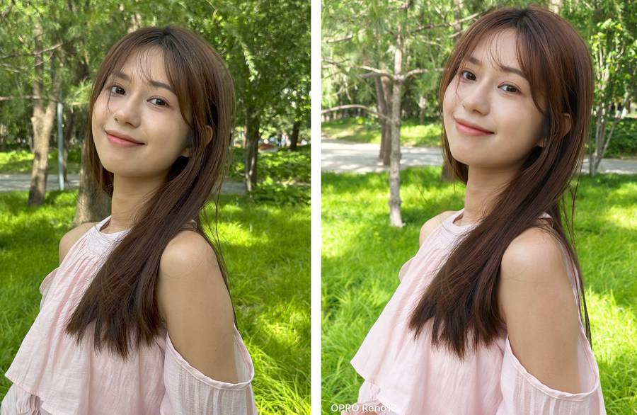 更为值得一提的是,在拍摄涉及人物的实况画面时,OPPO Reno12还支持AI人像算法,可精确检测出人脸的377个特征点,包括眼睛、鼻子、嘴巴、眉毛等关键部位,再根据不同的场景、年龄、性别等适配不同的美颜算法并进行深度学习,以达到更好的人像拍摄效果,让我们免去后期修饰的烦恼,而iPhone则完全是原图直出。从上面的实拍对比照片中也不难发现,OPPO Reno12拍摄的实况照片确实要比iPhone的Live Photo拍人更好看,不仅肤色更亮、更白,同时美颜效果也十分自然,没有过分的磨皮或者美化的虚假感。