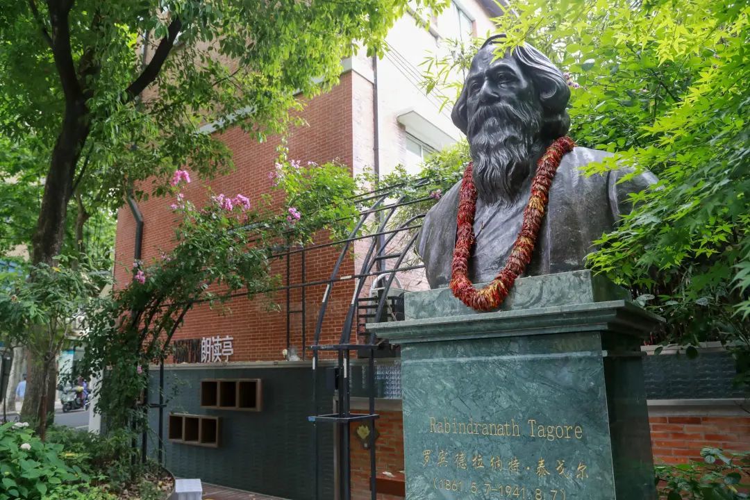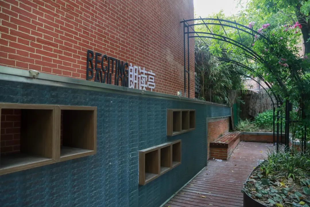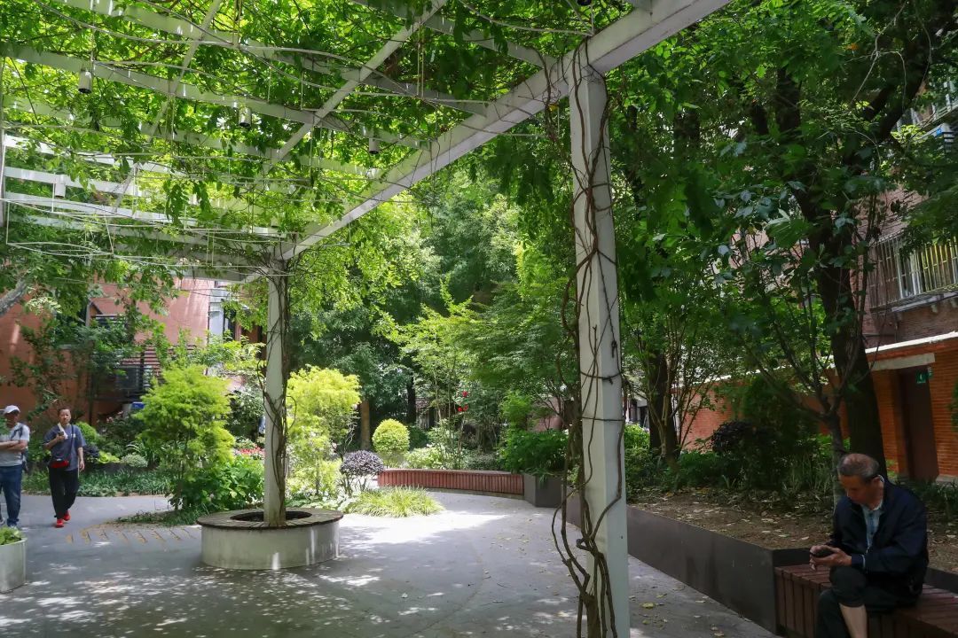 一路上的几处口袋花园散布在街头巷尾,各有特色,为这条写满历史的老马路添上了缕缕新意。特别是位于南昌路与茂名南路交叉口的阅读花园,抬高的花坛与泰戈尔雕塑交相辉映,增设的阅读廊架和琉璃书墙配上红砖元素塑造出不同高度的矮墙树池,小巧而精致的阅读空间还可供市民停驻小憩。