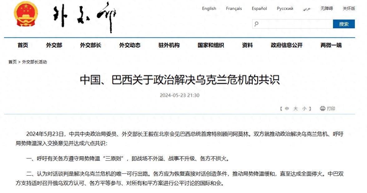 2024年5月23日,中共中央政治局委员、外交部长王毅在北京会见巴西总统首席特别顾问阿莫林。双方就推动政治解决乌克兰危机、呼吁局势降温深入交换意见并达成六点共识: