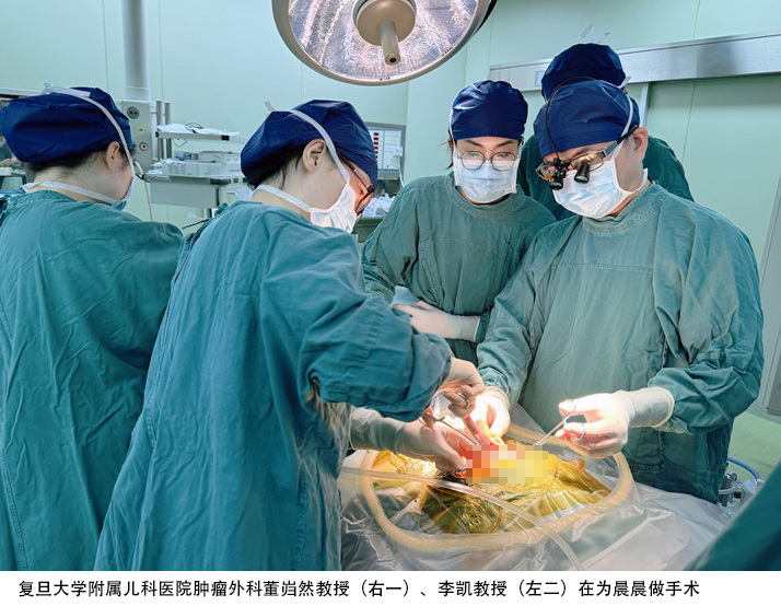 今年3月,晨晨转入复旦大学附属儿科医院肿瘤外科治疗,PET-CT检查结果提示,晨晨“肝门区存在代谢活跃的占位,间质性肿瘤可能”。随后,肿瘤外科专家为晨晨施行腹腔镜下肿瘤活检术。术中发现,肿瘤来自于肝脏,约8×6×7厘米,上顶门静脉和肝动脉,下压下腔静脉,肿瘤周边血供丰富。活检术中冰冻提示小细胞恶性肿瘤。