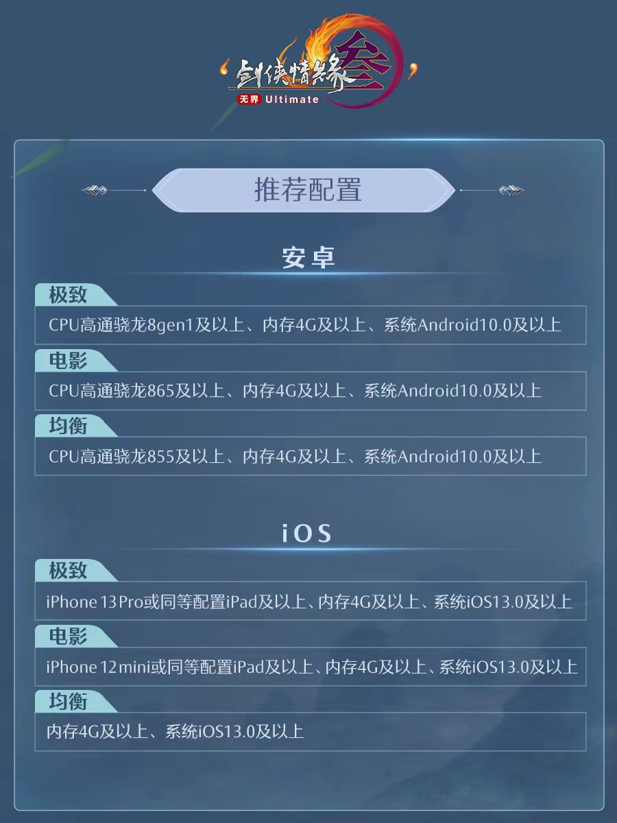 如果侠士意向购买新机的话,任意配置的骁龙8gen2/8gen3手机都能流畅运行极致画质。iOS因为iPad的型号、各个产品线、还分几代几代,相对来说比较复杂,大家可以对比同配置的iPhone,来选择最适合自己设备的画质档位。