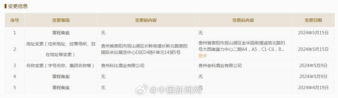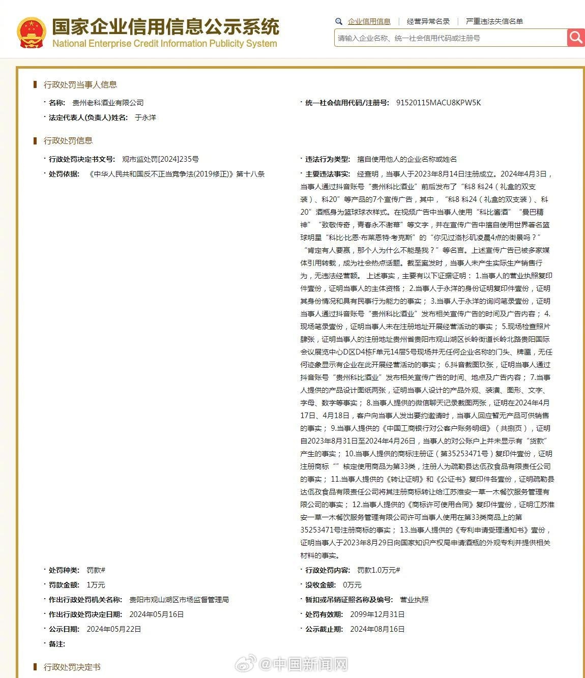5月24日,据中国新闻网消息,国家企业信用信息公示系统网站显示,近日,贵州老科酒业有限公司(曾用名:贵州科比酒业有限公司)因擅自使用他人的企业名称或姓名,违反反不正当竞争法,被贵阳市观山湖区市场监督管理局罚款1万元。