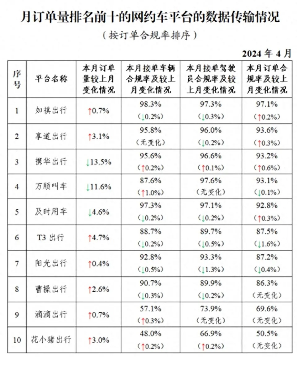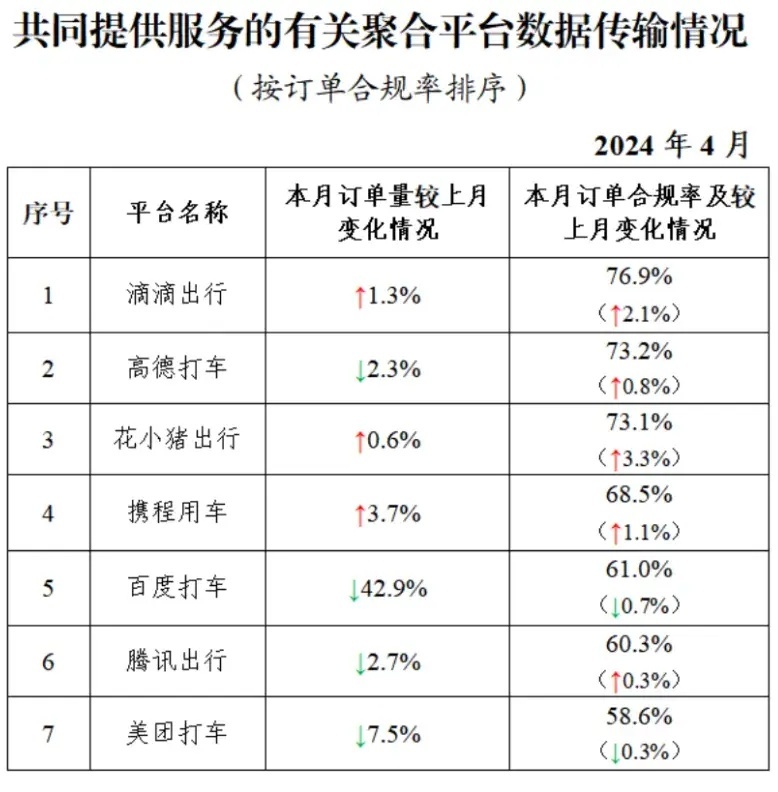 其中,面向乘客、与网约车平台公司共同提供服务的平台(俗称“聚合平台”)完成2.32亿单,环比下降3.6%。按订单合规率由高到低的分别是滴滴出行、高德打车、花小猪出行、携程用车、百度打车、腾讯出行、美团打车。