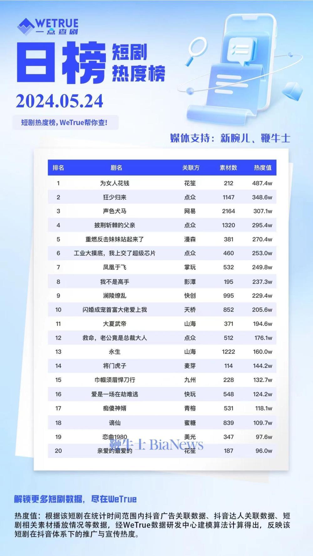 编者按:为帮助短剧从业者提供更多信息,专注于短剧报道的新腕儿和科技媒体鞭牛士联合WETRUE短剧热度榜共同推出短剧热度榜。