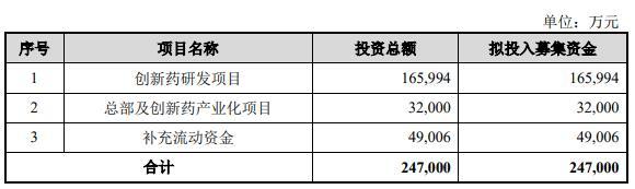 轩竹生物原拟募集资金247,000万元,用于创新药研发项目、总部及创新药产业化项目、补充流动资金。