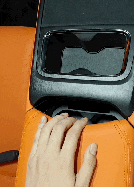 前排给了一个50W无线快充,后面是4个杯架,有两个要推开储物箱盖子才能看到。