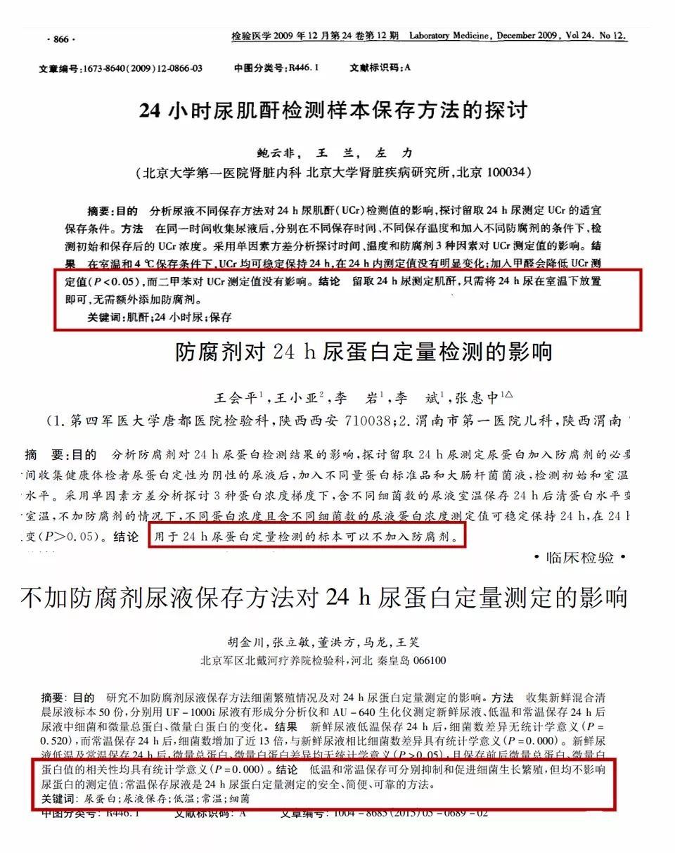 其实大家可以放心,很多研究都证实了,放不放防腐剂对24小时尿蛋白定量的检测没什么影响,结果仍然是准的,不用管什么细菌繁殖。